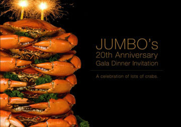 Adaptation of key branding elements to be consistent with campaign's marketing communications - "A celebration of lots of crabs". Right: Invitation card to Jumbo's 20th Anniversary Dinner.