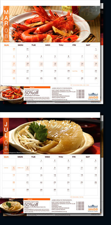 Jumbo Seafood Restaurant's 2008 calendar. Right: March and July pages from the calendar.