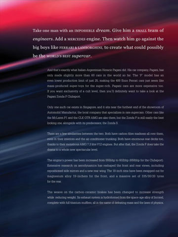 Editorial article and review on the S$3 million Pagani Zonda F supercar. Writing, photography and design by Levitate Studios. Right: Second page of article.
