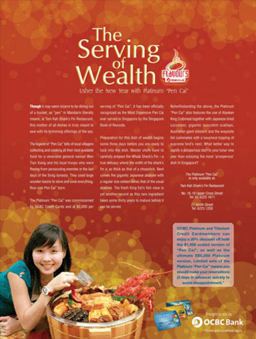 Magazine advertorial and marketing/PR campaign for OCBC Bank and Tam Kah Shark Fin's Restaurant. Right: First page detail.